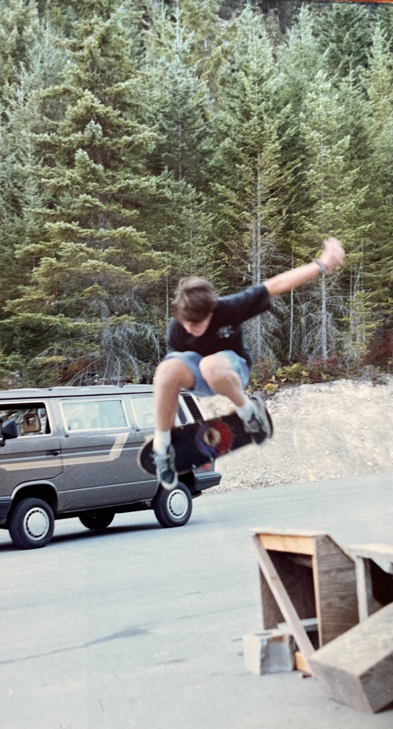 As far as skateboarding, this was of course prior to there being an established skateboard park in Whisler. So, we skateboarded in the village, ollieing off the stairs by the liquor store and getting chased by the bylaw officers, notwithstanding skateboarding was not officially banned from the village yet. We had a few locations with ramps in the valley and when it rained, we set up features in the lowest level of the underground parking underneath the conference centre. Often our parents drove us down to Sealyn Bowl in North Vancouver until there was a new bowl in Whistler. The Bones Brigade were our gods, and we know who Animal Chin is…”Have you seen him?”